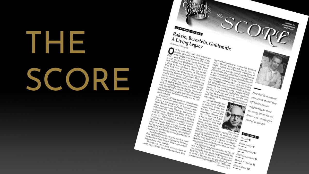 James Di Pasquale looks back at the legacy of Raksin, Bernstein, and Goldsmith. Bruce Broughton discusses writing for the tuba, and Jim McVay discusses guitar tunings. Lori Barth interviews Alf Clausen.